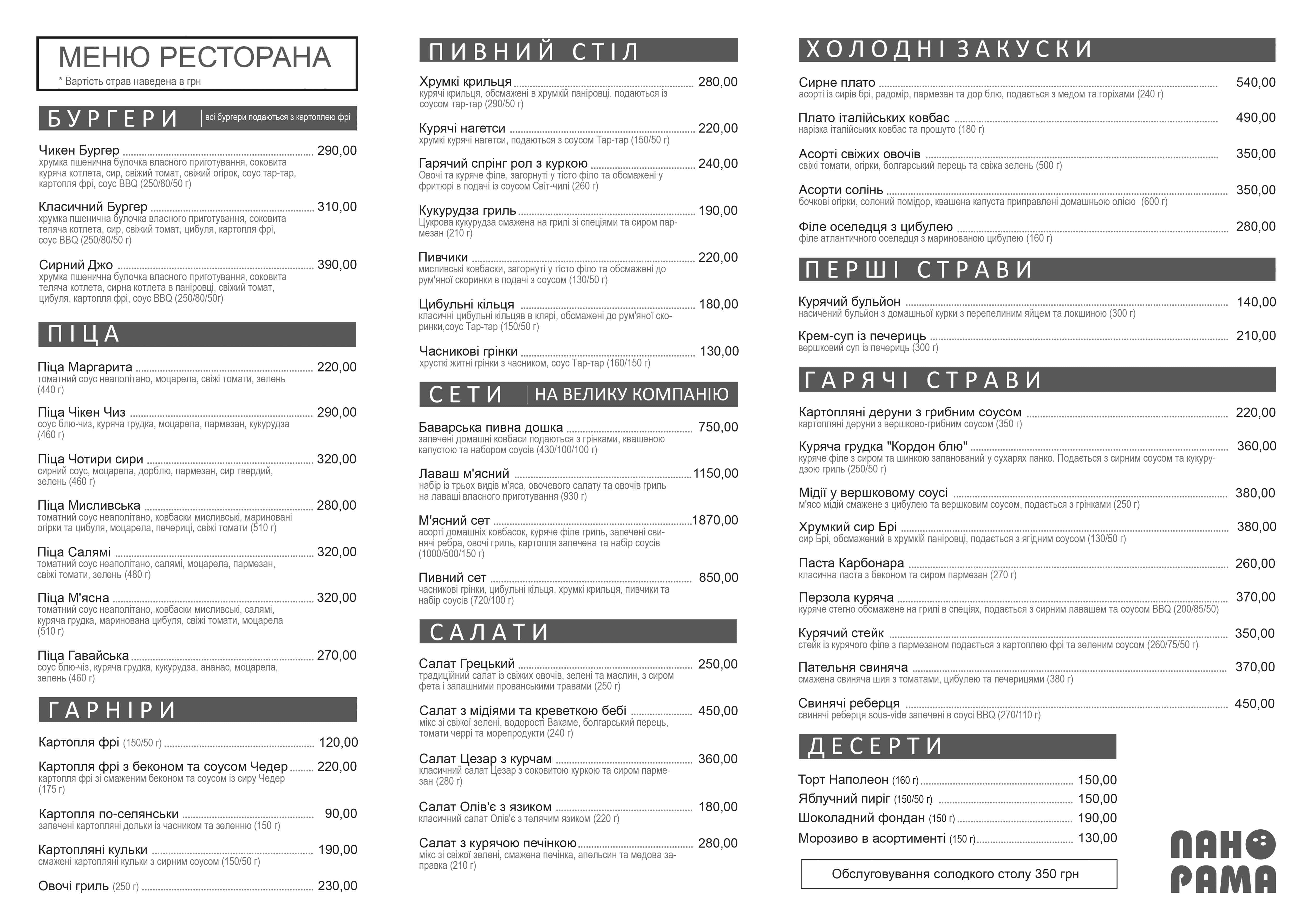 Меню ресторана